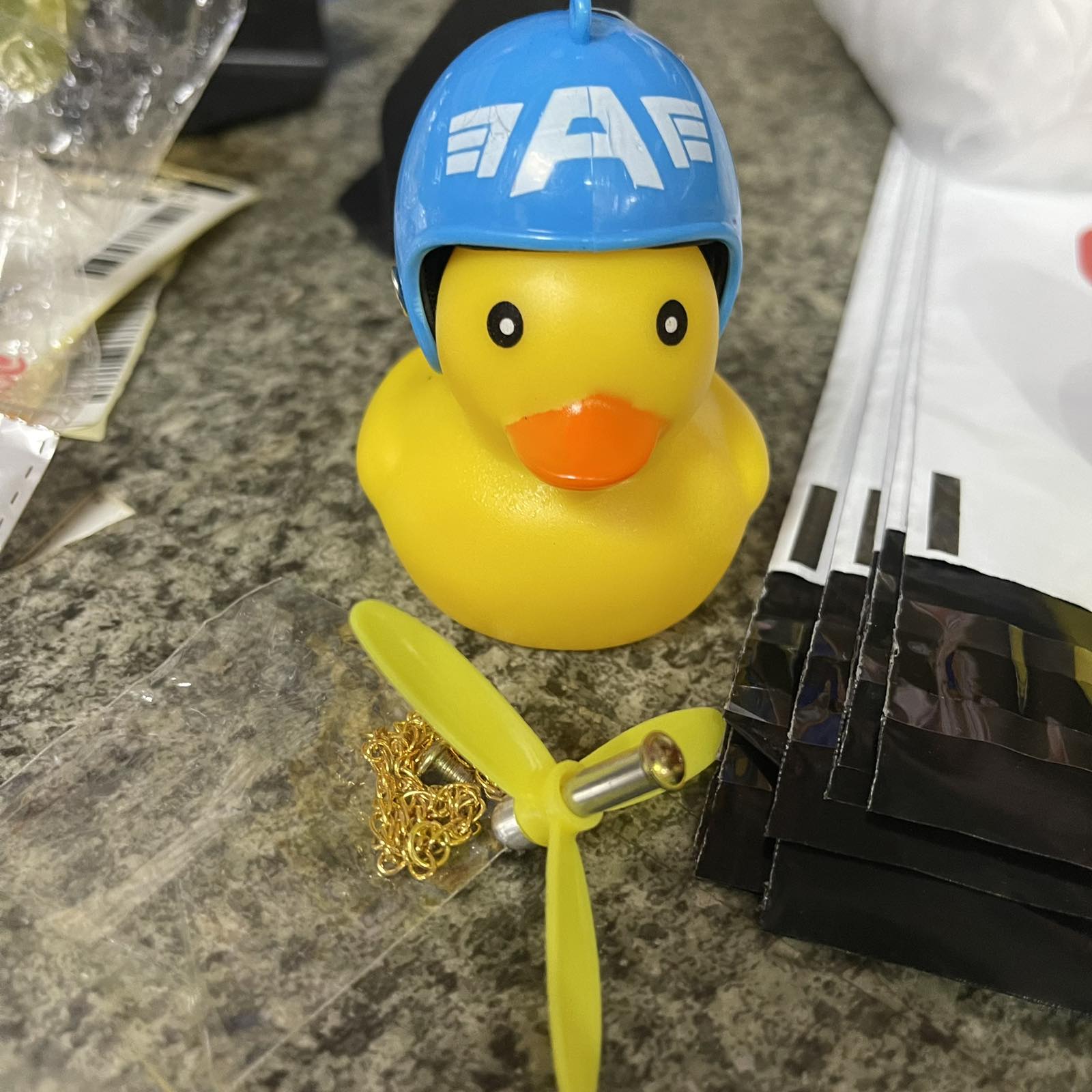Велосипедный звонок в виде милой уточки в шлеме. Станет вашим надежным другом во время езды на велосипеде или на другом транспортном средстве. Активно притягивает взгляды прохожих, а так же вызывает у них желание обзавестись таким другом. Встроенная подсветка обеспечивает дополнительную видимость в темное время суток. Издает характерный звук при нажатии на уточку (альтернатива велосипедному звонку). Пропеллер электричество не вырабатывает, но забавно вращается от встречного потока воздуха.