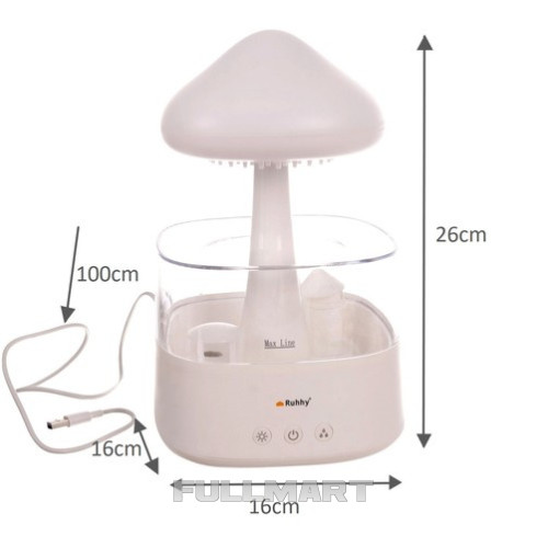 - СПЕЦИФИКАЦИЯ – цвет: белый; материал: ПП, другие: ПК + силикон + нержавеющая сталь + АБС; мощность: 10 Вт; эффект дождя: да; увлажнение: да; емкость: 450 мл; 8 цветов освещения; количество светодиодов: 6; противоскользящий силиконовый ободок снизу: да; длина шнура питания: 100 см; размеры: 26 х 16 х 16 см; вес: 0,6 кг; вес в упаковке: 1,2 кг.