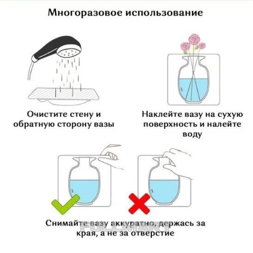 Не нужно сверлить стены, использовать двусторонний скотч, который плохо отмывается и другие крепления. Благодаря этому вы можете разместить ее где угодно или в любой момент переместить на другую поверхность. Благодаря материалу ваза может использоваться многократно, достаточно ее помыть.