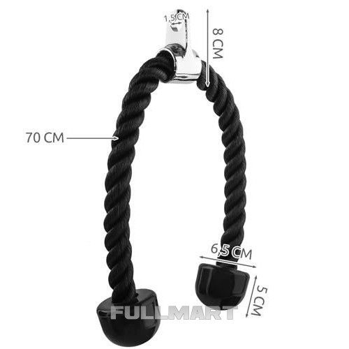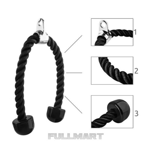 Веревка ручки изготовлена из плотно сплетенных прочных нейлоновых волокон ; ограничители на концах изготовлены из резины, что обеспечивает прочную и безопасную тренировку, а вращающаяся ручка изготовлена из металла, а это означает, что при использовании более крупных грузов нет риска повреждения устройства и нарушения безопасности; наконечник также защищает веревку от истирания.