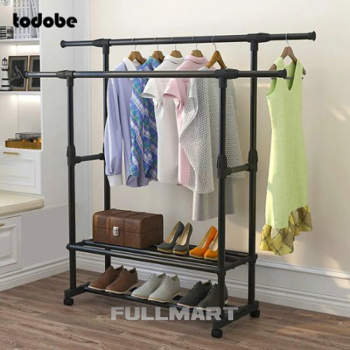 Вы сможете передвинуть стойку даже полностью завешенную одеждой. Стойка Double Pole Clother Hose выполнена как бы двухэтажной, для упорядочнивания и нормального, компактного, размещения одежды на ней. Боковые поперечные планки удобны для размещения на них, допустим, выглаженных брюк. Лучше всего для стойки использовать вешалки, так одежды можно разместить в разы больше.