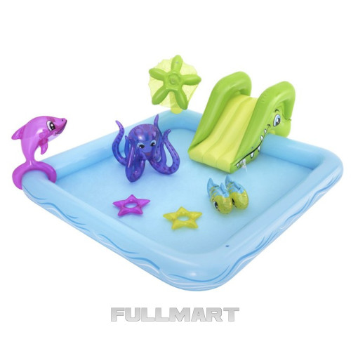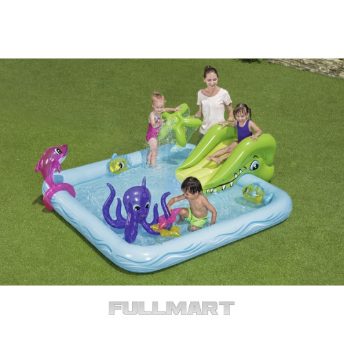 - ИНТЕРАКТИВНАЯ ПЛОЩАДКА - место, созданное для фантастических развлечений на свежем воздухе. Форма напоминает аквариум, типичный для подводного мира. Аттракцион бассейна – съемная надувная горка и надувные морские животные. На углу стоит пальма, из которой льется вода, когда подключаешь садовый шланг. Обилие форм и цветов побудит каждого поиграть в таком фантастическом бассейне.