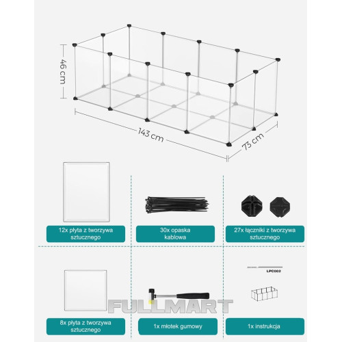 Этот кроличий выгул очень легко собрать. Просто соедините пластиковые панели с помощью угловых соединителей и входящего в комплект резинового молотка, чтобы создать выгул для вашего любимца в кратчайшие сроки.