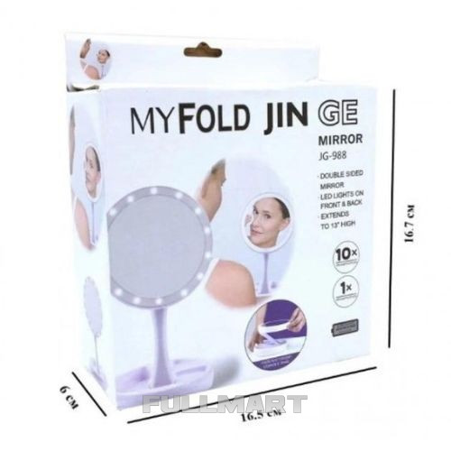 Зеркало My Fold Jin JG-988 имеет две стороны – одна изображает реальный размер, другая с увеличением вдесять раз. Оно оборудовано светодиодной подсветкой по бокам (работает от батареек 4 АА). В основе зеркала есть небольшой органайзер для разных мелочей. Благодаря небольшим габаритам (в сложенном состоянии 15.6 х 5.2 см) и сложному механизму вы можете пользоваться зеркалом в любом месте и даже брать с собой в путь.